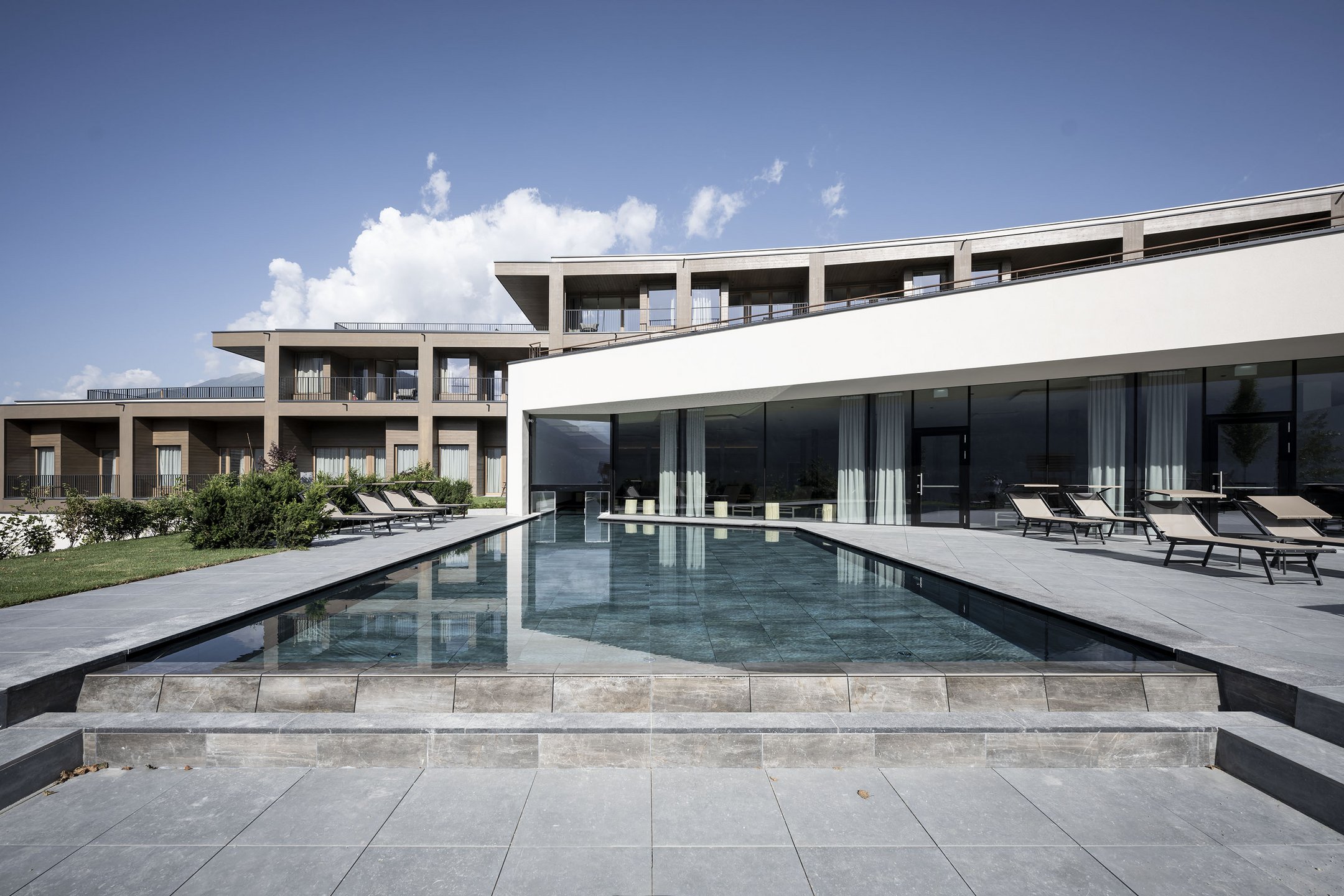 Auf die Erwachsenen wartet ein Adults-only-Spa-Bereich, die großzügigen Zimmer und Suiten und die gemütliche Lounge mit der verglasten Front und Blick über die Apfelwiesen ins Grüne.